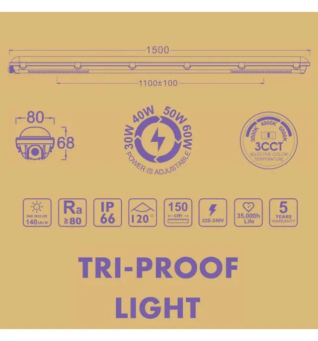 Pantalla estanca LED GXtronic 150cm combina potencia y versatilidad con selección de potencia (30W / 40W / 50W / 60W) y temperatura de color 3CCT (3000K / 4000K / 6000K). Equipada con driver Gxtronic y LEDs SMD2835 OSRAM CHIP de 140 Lm/W, ofrece máxima eficiencia (FP > 0.9), protección IP66 e IK10, y una luz uniforme y brillante en cualquier entorno, cubierta semitransparente.