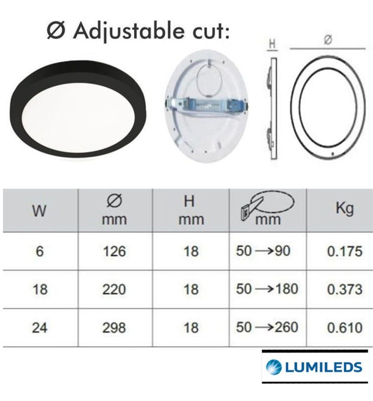Você tem problemas porque o orifício é muito grande ou muito pequeno para instalar o downlight ou a luminária de teto LED? A solução! Com o novo modelo de luminária MOSS com potência de 18W, DIÂMETRO DE CORTE AJUSTÁVEL (Diâmetro do furo de 50mm a 180mm) e cor selecionável, você não terá nenhum problema em instalá-la, pois se ajusta ao diâmetro do furo graças ao sistema deslizante de fixação . APROVEITE SEU DOWNLIGHT + TETO + CCT + AJUSTÁVEL AGORA! 6 OPÇÕES DE PRODUTOS EM APENAS 1!