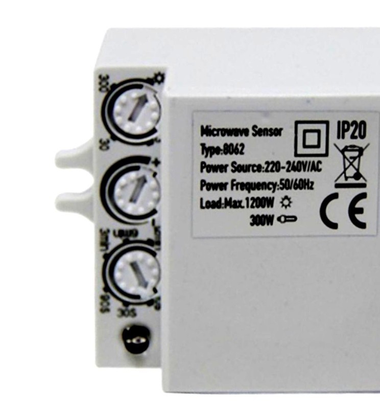 Detector de movimento de micro-ondas, perfeito para instalação em teto falso que permite ajustar o tempo de ignição, sensibilidade à luz e faixa de parada. Tem um ângulo de cobertura de 150º e um campo de detecção de até 5 metros.