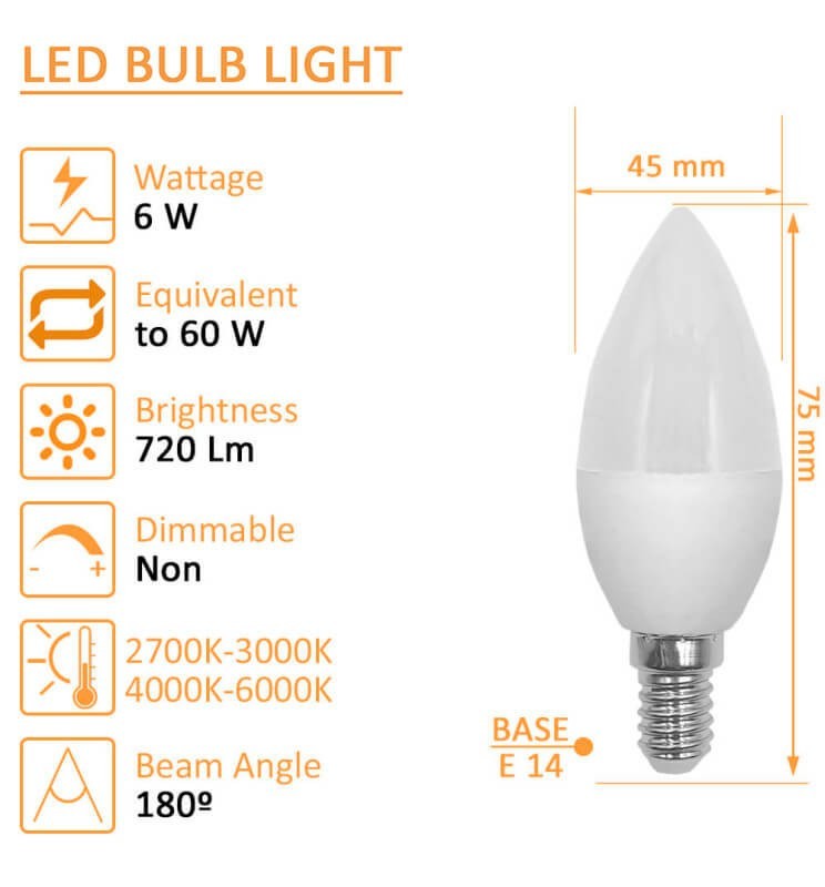 Seus diodos SMD 2835 High Lumens OSRAM Chip fornecem equivalente ao brilho de uma lâmpada convencional de cerca de 50W. Desta forma, a economia de energia de 80% é alcançada. A luz exposta é distribuída em um ângulo de 180º e tem um índice de renderização de cores de +80, indicativo da qualidade da luz fornecida pela nossa lâmpada LED E14 C37 de 6W.