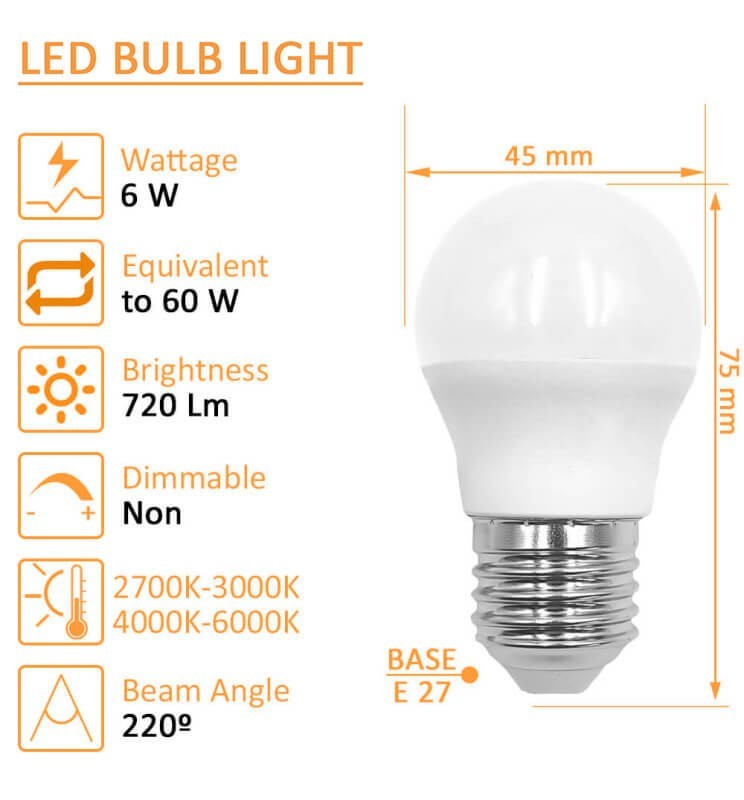 Seus diodos SMD 2835 High Brightness OSRAM Chip fornecidos são equivalentes ao brilho de uma lâmpada convencional de cerca de 50W. Desta forma, a economia de energia de 80% é alcançada. A luz exposta é distribuída em um ângulo de 220º e tem um índice de renderização de cores de +80, indicativo da qualidade da luz fornecida pela nossa lâmpada LED E27 G45 de 6W.