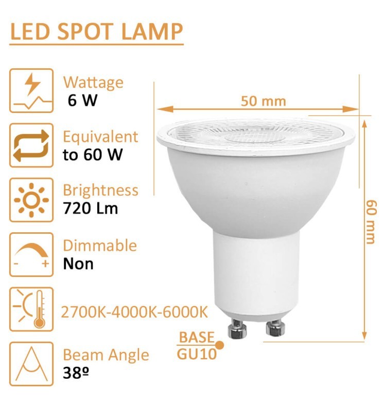 Nosso LED dicroico 220v com diodo SMD 2835 OSRAM Chip e bucha GU10 de 6We é especialmente projetado para usos onde pela altura do teto precisamos concentrar o feixe de luz e focar a luz nas áreas desejadas graças aos seus 60º de abertura. O material com o qual é feito é alumínio e PC.