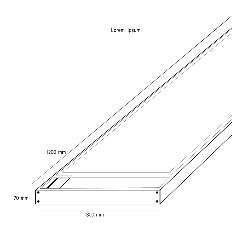 Novo kit de superfície de 1200 x 300 x H68mm em branco, feito de alumínio. Ele é projetado para oferecer a possibilidade de instalar painéis de LED 120x30 em locais onde o teto não é removível.
