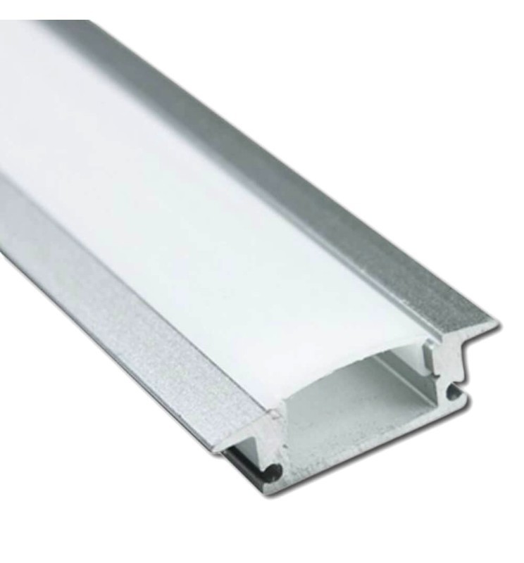Perfil de alumínio para fita de LED, perfeito para paredes e tetos, para encaixar e empotar em todos os tipos de materiais, como madeira, gesso cartonado, etc. A forma da asa do perfil torna perfeito o toque final da colocação. O produto inclui todos os acessórios: tampa da tampa, terminais e grampos de fixação.